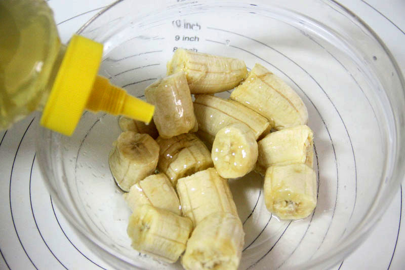 3、 香蕉去皮掰成段,因为香蕉容易氧化发黑,所以可先滴入几滴柠檬汁。