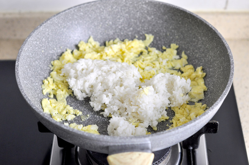 6、倒入米饭炒散。