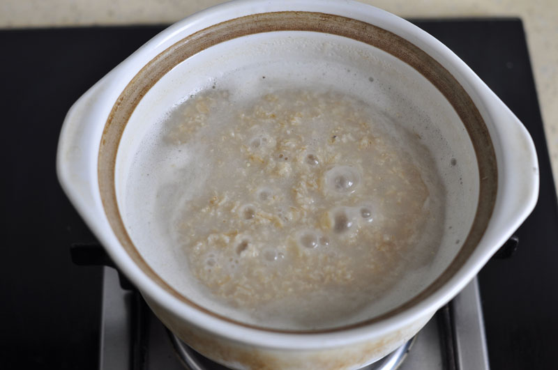 6、捞出生姜片,把燕麦片加到排骨汤中继续煮。