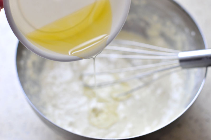8、华夫饼机预热后刷上适量的油。(没有华夫饼机,可以用平底锅煎。)将面糊倒入华夫饼机中,不用太满因为面糊在加热的过程中会膨胀。